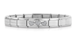 Gotowa bransoletka Nomination Composable Classic składająca się ze stalowej podstawy 18 elementowej oraz 1 ozdobnego elementu wykonanego z srebra próby 925 i cyrkonii na stali szlachetnej.