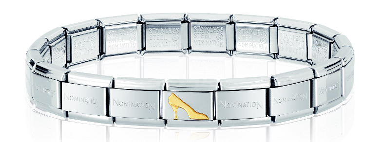 Gotowa bransoletka Nomination Composable Classic składająca się ze stalowej podstawy 18 elementowej oraz 1 ozdobnego elementu wykonanego z 18-karatowego złota na stali szlachetnej.