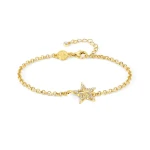 Bransoletka Nomination Italy z kolekcji Truejoy z motywem gwiazdki. Bransoletka wykonana ze srebra próby 925 pokrywanego 24K zlotem. Ozdobiona diamentowaną zawieszką w kształcie gwiazdki otoczonej cyrkoniami. Zapinana na karabińczyk. Zobacz inne modne bransoletki dostępne w naszym sklepie.