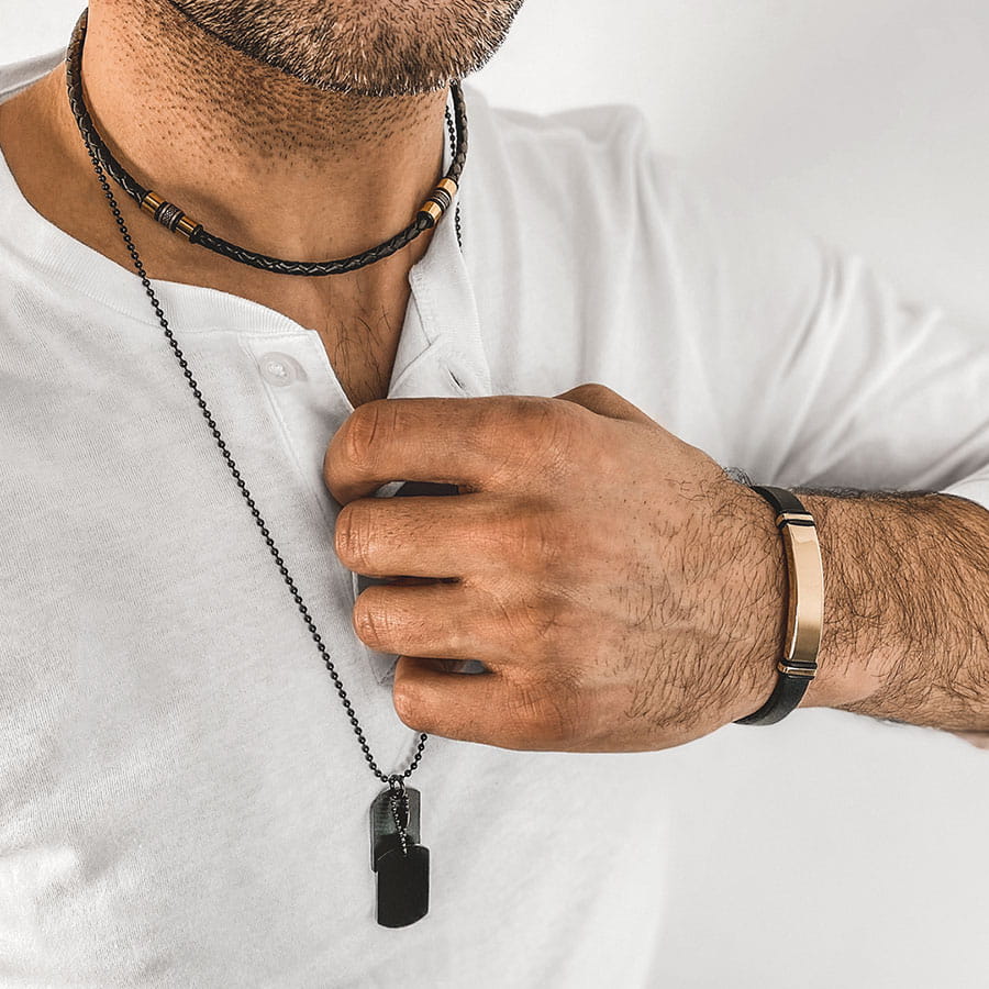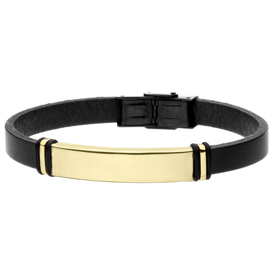 Bransoletka męska Manoki wykonana ze skóry naturalnej i stali szlachetnej 316L pokrywanej żółtym złotem 14k. Posiada blaszkę idealną pod grawer.