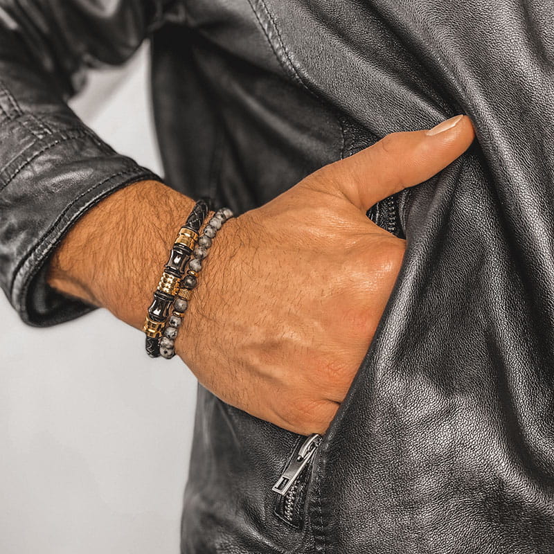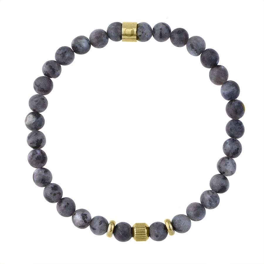 Bransoletka męska Manoki wykonana z kamienia naturalnego (szary labradoryt) i stali szlachetnej 316L. Sprawdź inne męskie bransoletki w naszym sklepie z biżuterią.