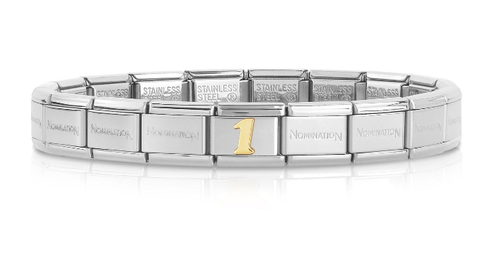 Gotowa bransoletka Nomination Composable Classic składająca się ze stalowej podstawy 18-elementowej oraz 1 ozdobnego elementu wykonanego z 18-karatowego złota na stali szlachetnej.