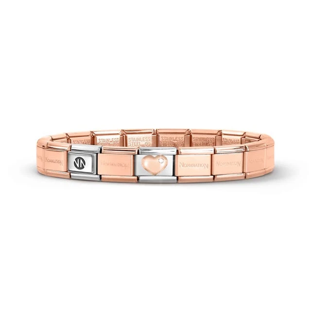 Gotowa bransoletka Nomination Composable Classic składająca się ze stalowej podstawy 18 elementowej w kolorze rosegold oraz 1 ozdobnego elementu wykonanego z różowego złota próby 9k na stali szlachetnej.