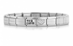 Gotowa bransoletka Nomination Composable Classic składająca się z 18-elementowej stalowej podstawy oraz 2 ozdobnych elementów wykonanych ze srebra próby 925 i cyrkonii na stali szlachetnej.