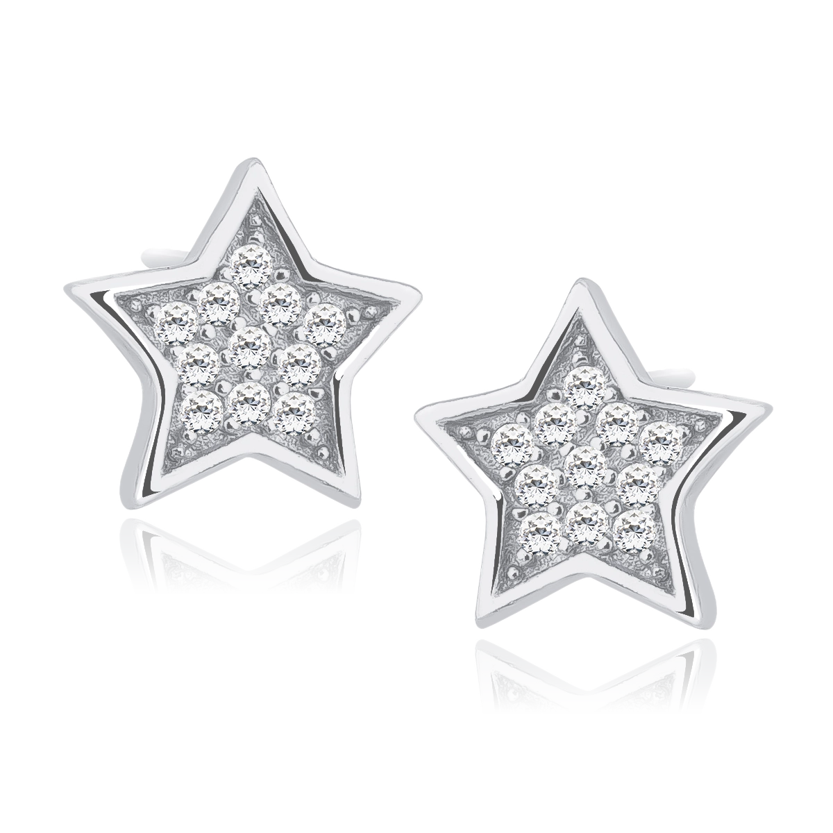 Srebrne kolczyki wykonane ze srebra próby 925 z białymi cyrkoniami w kształcie gwiazdek, o wymiarach ok. 8 mm × 8 mm i klasycznym zapięciu na sztyft.