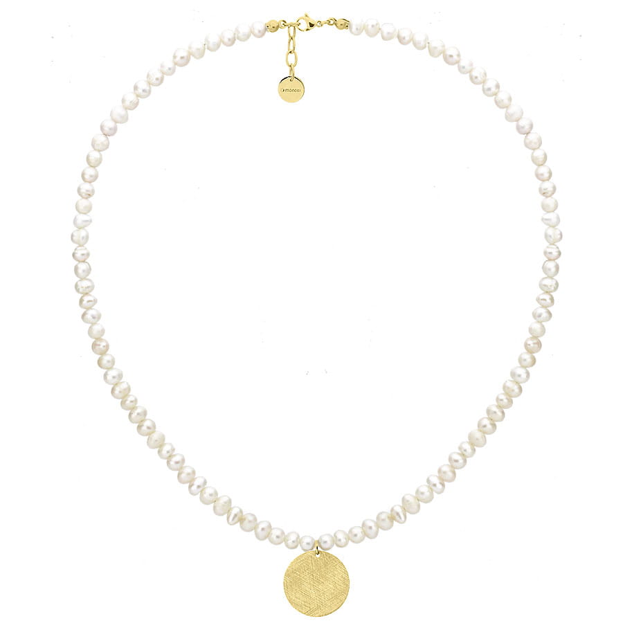 Naszyjnik z perełek hodowlanych w kolorze białym oraz pozłacana 14k złotem stal szlachetna.