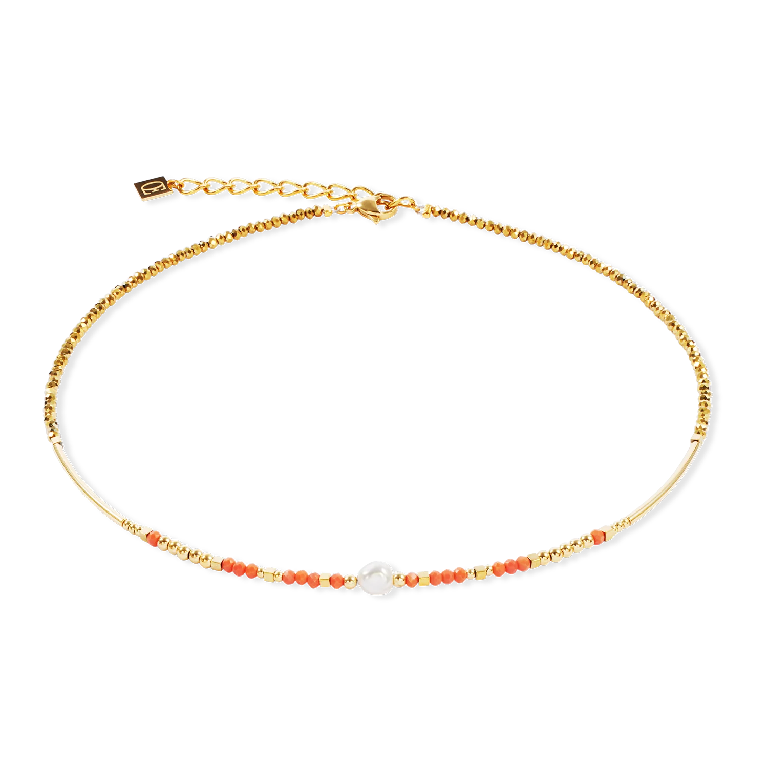 Naszyjnik niemieckiej marki Coeur de Lion wykonany z wysokiej jakości stali szlachetnej 316L oraz fasetowanych koralików w kolorze koralowym oraz złotym. Naszyjnik ozdobiony perełką. Naszyjnik zapinany na karabińczyk z możliwością regulacji.