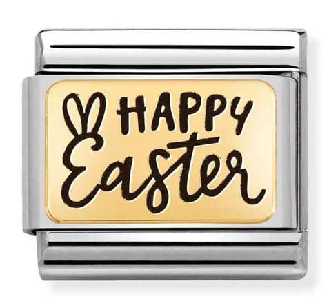 Link ozdobny z kolekcji Nomination Composable Gold z napisem Happy Easter (Wesołych Świąt Wielkanocnych). Element wykonany został ze stali szlachetnej w kolorze srebrnym, ze złota 18K próby 750 oraz emalii.