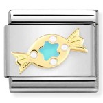 Element wymienny do bransoletki personalizowanej Nomination z motywem niebieskiego cukierka (Torquoise Green Sweet). Baza elementu wykonana jest ze stali szlachetnej, a symbol to 18K złoto próby 750 i emalia.