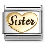 Link Nomination z kolekcji Gold wykonany z wysokiej jakości stali szlachetnej, emalii i symbolu z 18K złota próby 750. Symbol przedstawia serce z napisem "Sister" - Siostra.