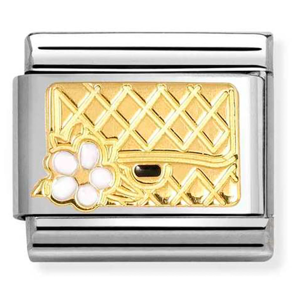 Element do bransoletki komponowanej Nomination Italy z torebką z kwiatkiem (Bag with Flower). Link wykonany ze stali szlachetnej, a symbol ze złota 18K próby 750 i emalii.