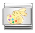 Link ozdobny z kolekcji Nomination Composable Gold z zajączkiem i pisanką (Bunny with Easter Egg). Element wykonany został ze stali szlachetnej w kolorze srebrnym, ze złota 18K próby 750 i emalii.