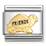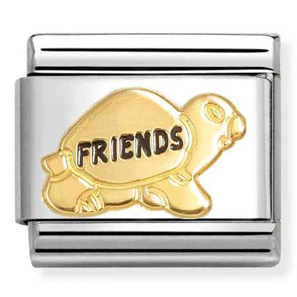 Żółw z napisem "Friends" (FRIENDS Turtle) - element do bransoletki komponowanej marki Nomination Italy wykonany z 18K złota i emalii na stali szlachetnej. Pasuje do wszystkich podstaw z kolekcji Composable Classic.