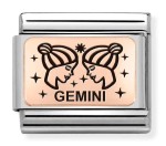 Element do bransoletki komponowanej Nomination Italy. Link wykonany ze stali szlachetnej, 9K różowego złota i emalii. Przedstawia znak zodiaku bliźnięta (Gemini).
