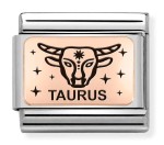 Link ozdobny z kolekcji Nomination Composable Rose Gold z blaszką ze znakiem zodiaku byk (Taurus). Element wykonany został ze stali szlachetnej w kolorze srebrnym, różowego złota 9K i emalii.