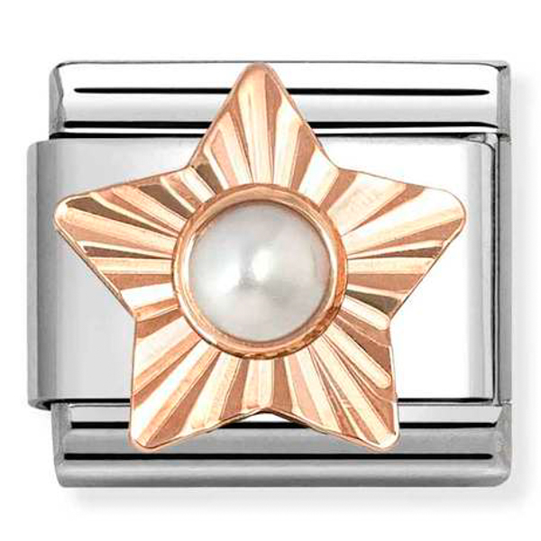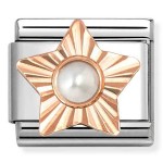 Diamentowana gwiazdka z perełką (Star with Etched Detail and White Pearl) - link Nomination z kolekcji Rose Gold wykonany z wysokiej jakości stali szlachetnej, 9K różowego złota oraz perełki.