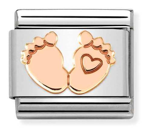 Element wymienny do bransoletki personalizowanej Nomination z symbolem dziecięcych stópek z serduszkiem (Baby Feet) z 9K różowego złota. Baza elementu wykonana jest ze stali szlachetnej.
