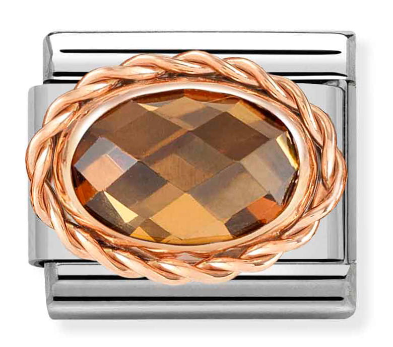 Smoky CZ - link Nomination z kolekcji Rose Gold wykonany z wysokiej jakości stali szlachetnej i szampańskiej cyrkonii w oprawie z 9K różowego złota.