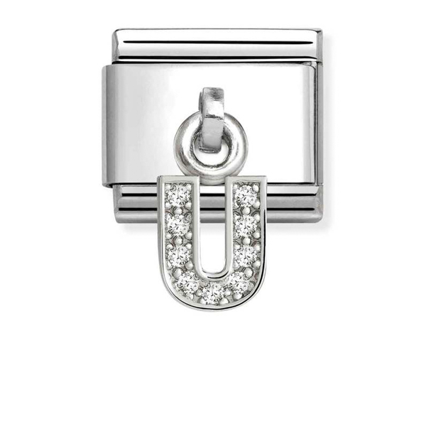 Link ozdobny z kolekcji Nomination Composable Silver z wiszącą literą "U". Element wykonany został ze stali szlachetnej w kolorze srebrnym, cyrkonii oraz ze srebra próby 925.
