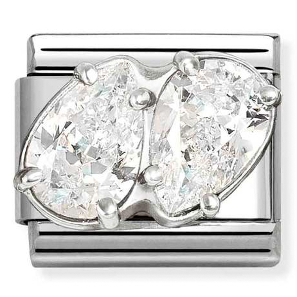 Element wymienny do bransoletki personalizowanej Nomination z dwiema cyrkoniami w kształcie łezki (Twin CZ Drops). Baza elementu wykonana jest ze stali szlachetnej, a symbol to srebro próby 925 i cyrkonie.