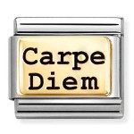 Link Nomination Italy z napisem „Carpe Diem”. Wykonany został z wysokiej jakości stali szlachetnej, która zapewnia trwałość i odporność na codzienne użytkowanie, a ozdobny napis wykończono w 18-karatowym złocie z kontrastowym, czarnym grawerem. To minimalistyczny, a jednocześnie wyrazisty detal, który doskonale wpisuje się w ideę personalizowanej bransoletki Composable – możesz dodać go jako symbol chwili, motywacji lub osobistego przesłania i stworzyć biżuterię, która naprawdę coś znaczy.