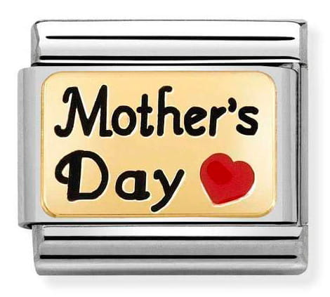 Link Nomination z kolekcji Gold wykonany z wysokiej jakości stali szlachetnej i symbolu z 18K złota próby 750 oraz emalii. Symbol przedstawia napis Dzień Matki oraz czerwone serce (MOTHER’S DAY with Red Heart).