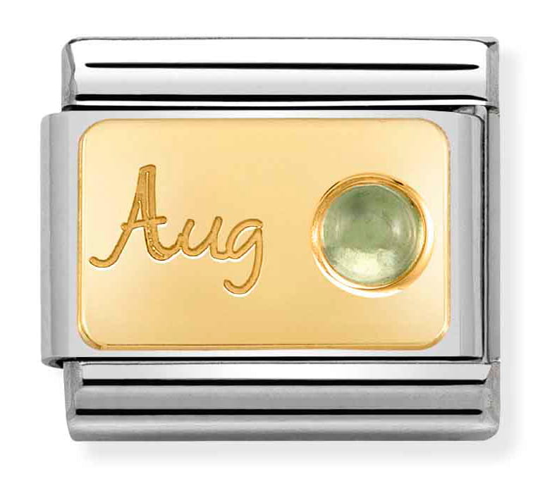 Link ozdobny z kolekcji Nomination Composable Gold z grawerem urodzinowym. Element wykonany został ze stali szlachetnej w kolorze srebrnym, ze złota 18K próby 750 i kamienia szlachetnego — oliwinu. Dedykowany osobom urodzonym w sierpniu. Idealny pomysł na prezent urodzinowy!