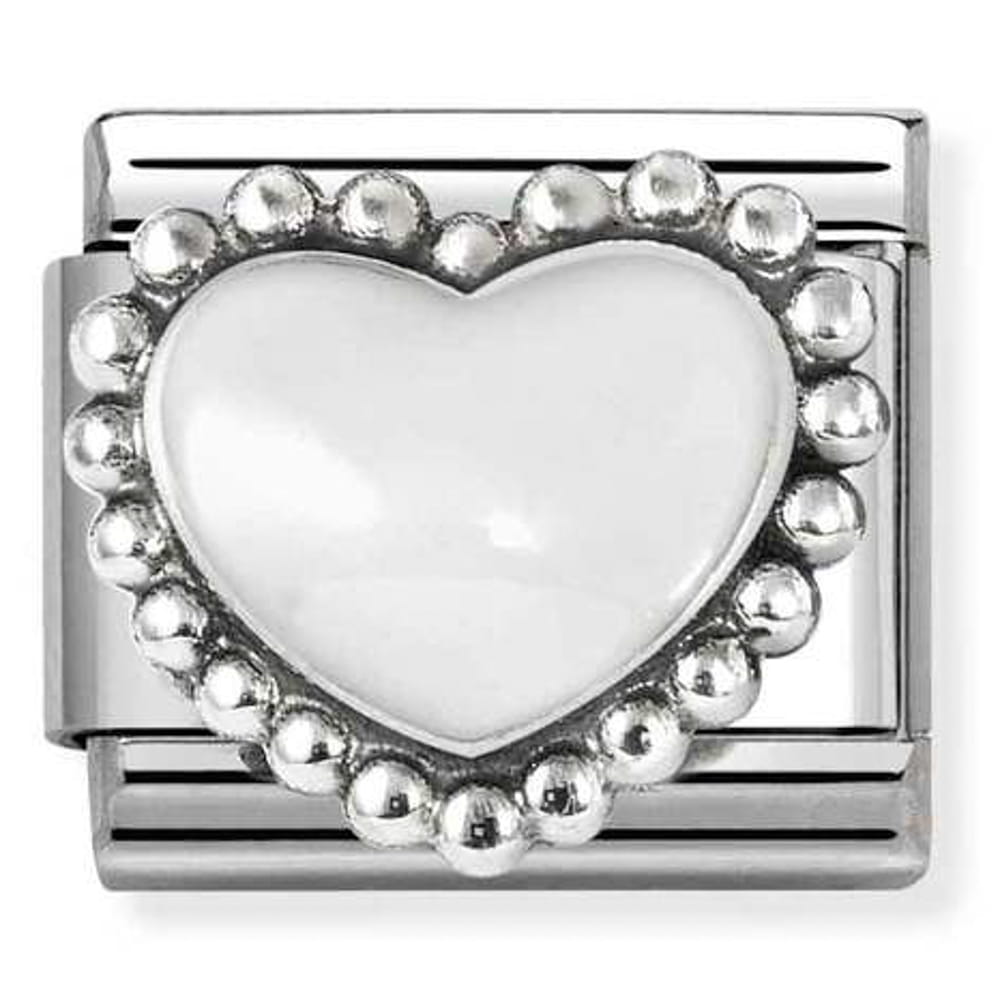 Element do bransoletki komponowanej Nomination Italy z białym sercem (White Heart). Link wykonany ze stali szlachetnej i srebra próby 925.