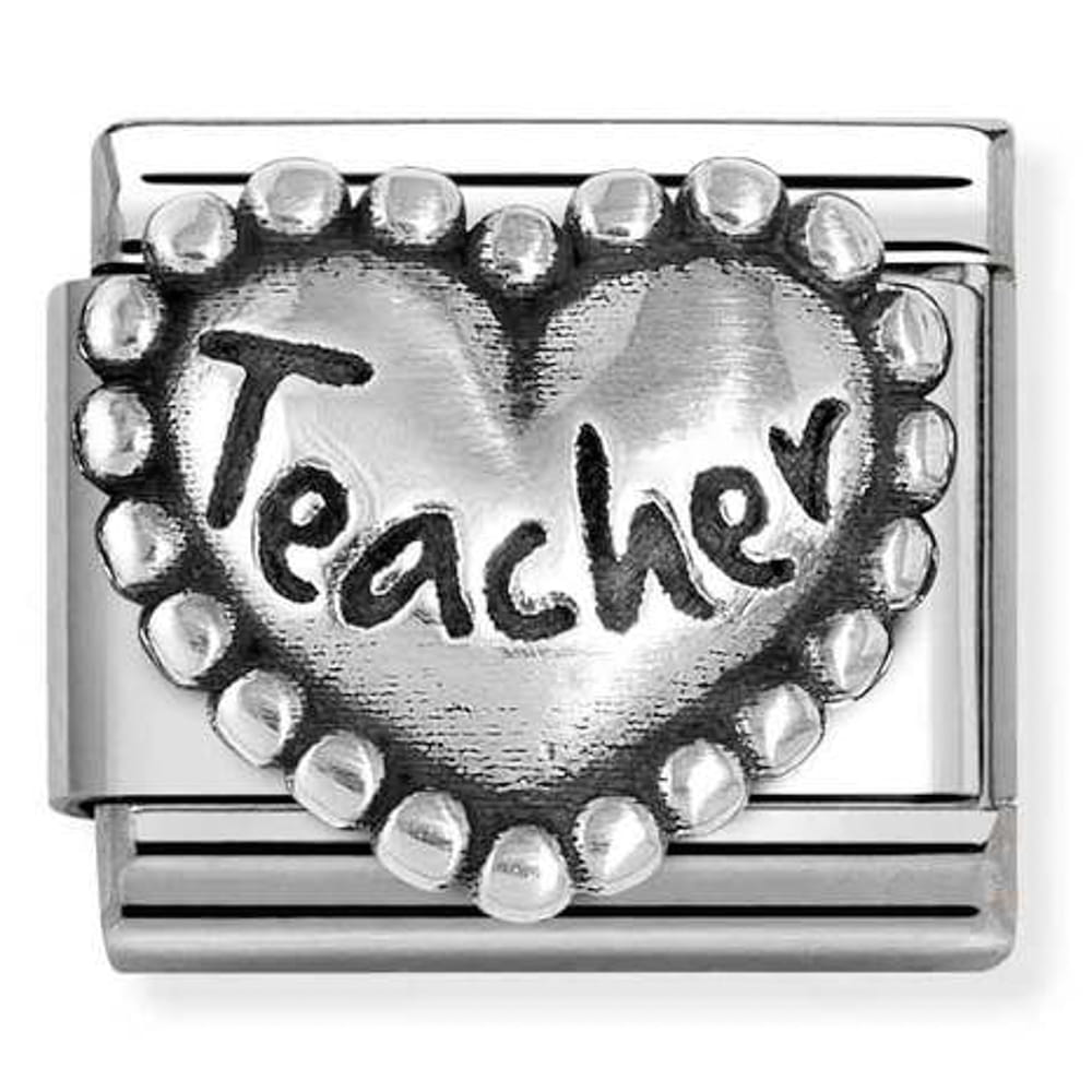Element do bransoletki komponowanej Nomination Italy z symbolem serca z grawerem Teacher (Nauczyciel). Link wykonany ze stali szlachetnej i srebra próby 925.