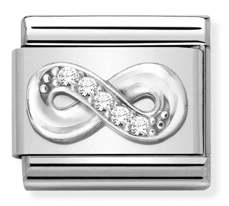 Element do bransoletki komponowanej Nomination Italy z symbolem nieskończoności (Infinity CZ). Link wykonany ze stali szlachetnej, a symbol ze srebra próby 925 i cyrkonii.