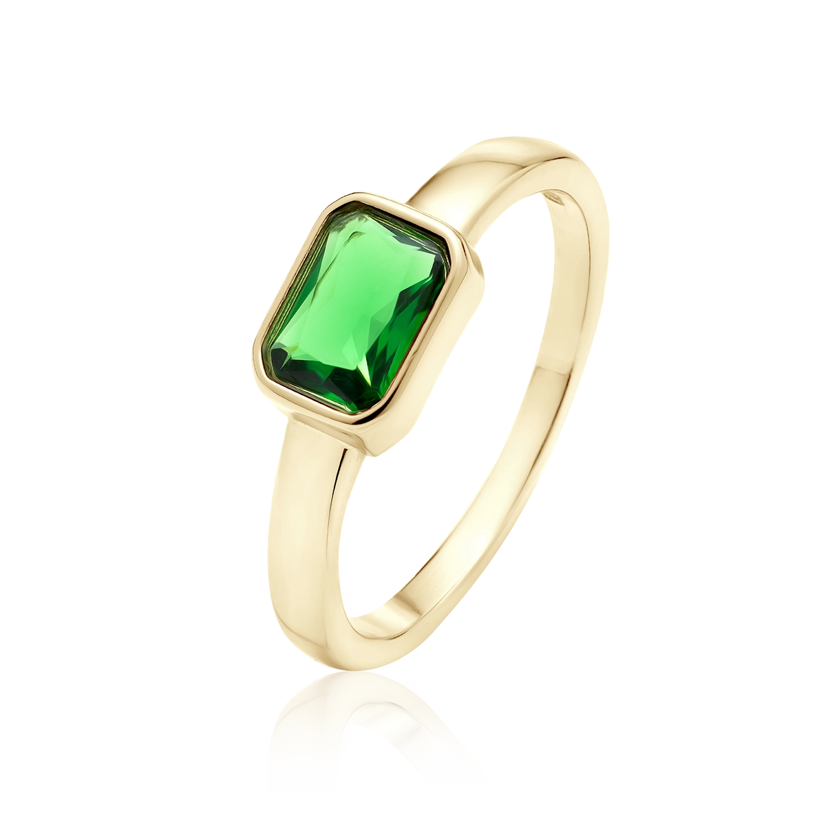 Pierścionek wykonany ze srebra próby 925 pokrywanego 14K złotem. Ozdobiony szmaragdową cyrkonią. Nie zawiera niklu, kadmu i ołowiu.