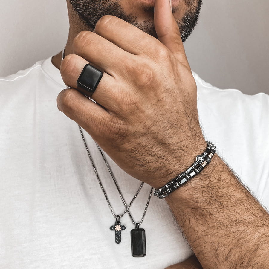 Sygnet męski marki Manoki wykonany ze stali szlachetnej z czarną powłoką PVD. Idealny prezent dla Niego na Walentynki, Dzień Chłopaka, urodziny, czy inną okazję.