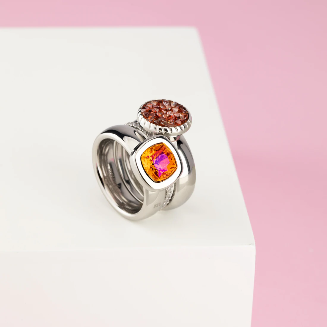 Zestaw biżuterii Melano z kolekcji VIVID i FRIENDS. Jest to gotowa kompozycja pierścionków ze specjalnie dobranymi elementami wymiennymi (oczkami) i obrączką. Każdy pierścionek (baza) daje możliwość dowolnej nieograniczonej wymiany elementów wymiennych. Każdego dnia możesz dowolnie komponować swoją biżuterię, bawiąc się kolorami, kształtami…. zmieniając oczka. Tworząc swój niepowtarzalny styl.